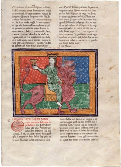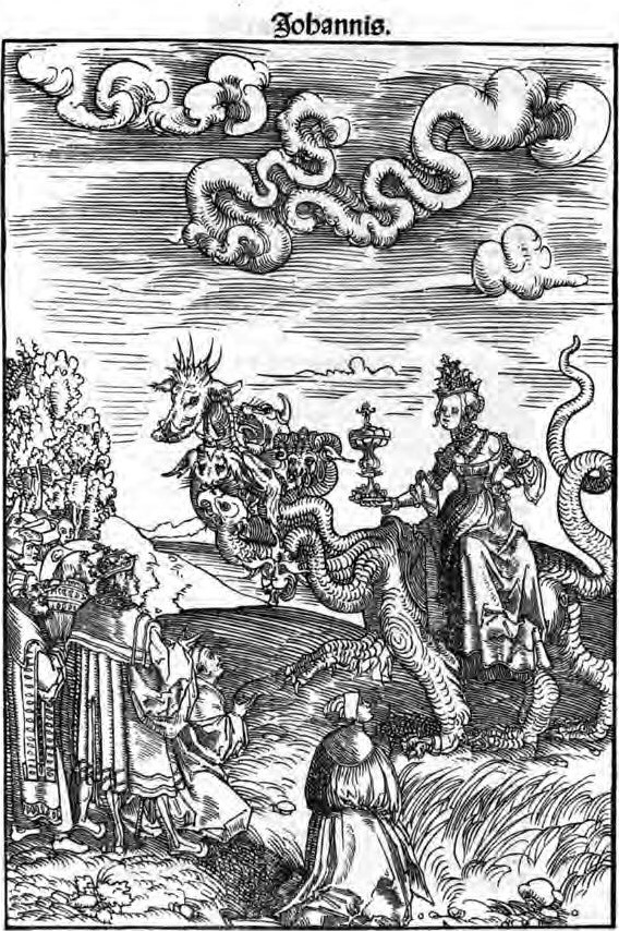 Earlier depictions of this story, like Beatus of Liébana’s illustration, draw the “Whore of Babylon” with a smaller crown, meant to represent one that would be worn by Islamic kings, insinuating that Muslims are the “Whores of Babylon.” This can be seen again during the early fifteenth century with Albrecht Dürer’s 1498 depiction in which the “Whore” is depicted in contemporary Italian clothing, which may be a commentary on the state of Italian citizens.