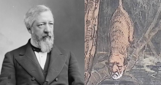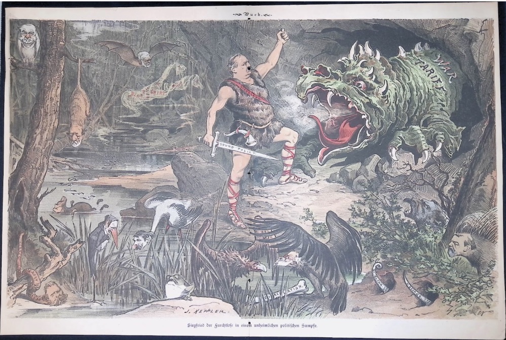 While this anthropomorphism was a means to draw faces accurately, it is also likely that this was very humorous for audiences at the time, since they would be seeing politicians they did not like or agree with depicted in an unflattering way. He also did, at times, deliberately caricature specific politicians as a means of mocking them even further. Some politicians that this regularly happened to were Benjamin Butler and Roscoe Conkling. Conkling was frequently drawn as a rooster with Keppler suggesting he was a very proud man and full of himself. Butler was drawn as a frog suggesting he was cold blooded (Satire on Stone: The Political Cartoons of Joseph Keppler; p. 130). Keppler’s use of this style in his cartoons stands out from other cartoonists at the time.