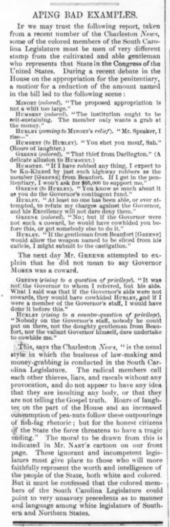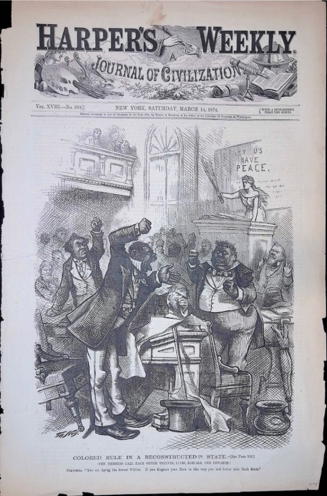 What I found the most interesting about these cartoons was the fact that they represented Gilded Age popular humor in its heyday. Today we look at these cartoons and see how blatantly racist they are by depicting white politicians in blackface as a means to demean the politicians by inferring that “to be black” equates to “to be inferior,” but during its time, Americans purchased these illustrated magazines as a means to laugh. The success of these magazines correlates to how entertaining and funny the comics were within them, and given their circulation numbers, it’s safe to assume that people did find these cartoons humorous.