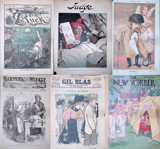 The materials come from pages of magazines such as Puck, Judge, Vanity Fair, Vanity Fair, Harper’s Weekly, Gil Blas, Le Charivari, Truth, The New Yorker, The Illustrated London News, The New York Herald, and The Sun. There are also pages from books such as Les Gens de Paris and prints from other publications such as Treager’s Black Jokes, and publishers such as S.W. Fores, Currier & Ives, and J. Sidebotham. There are also prints from the artist Thomas Rowlandson. The collection is split into Series I: Puck Magazine Prints, 1879-1899; Series II: Judge Magazine Prints, 1882-1900; Series III: Vanity Fair Magazine Prints, 1869-1931; Series IV: Harper’s Weekly Magazine Prints, 1868-1880; and Series V: Other historic magazine prints, 1802-1950. Below is a collage of some of the incredible covers from this vast collection of political cartoons.