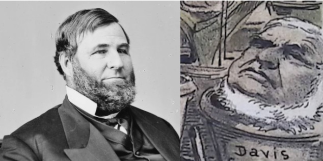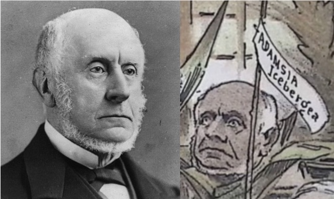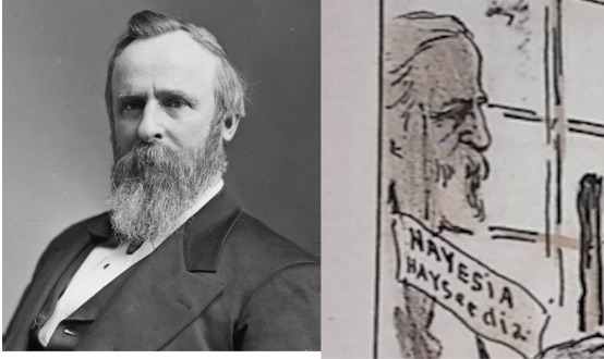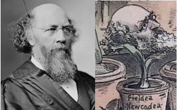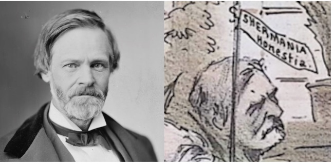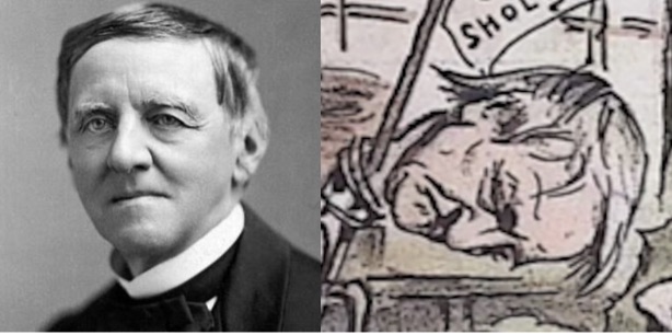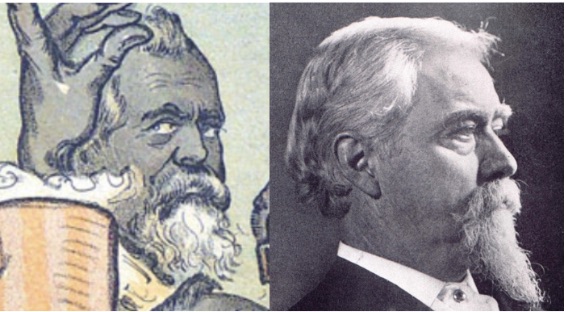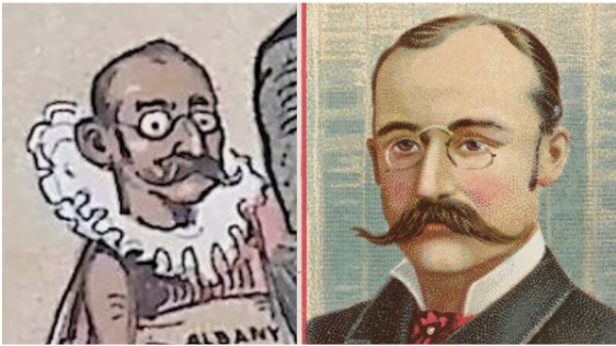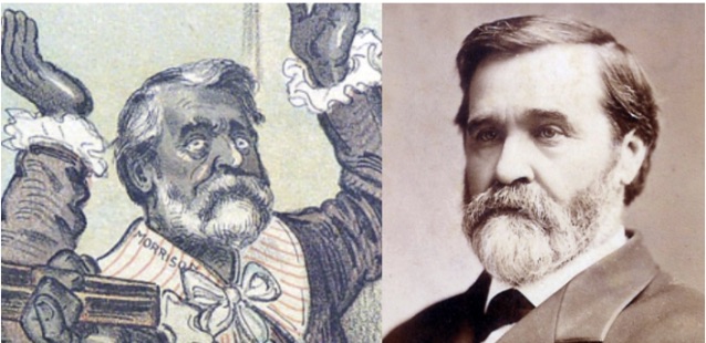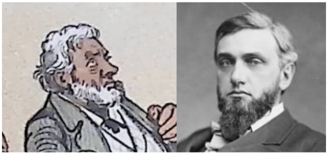 William Evarts and Chauncey Depew: Evarts was former U.S. Attorney General under Andrew Johnson’s administration in 1868 to 1869, former Secretary of State under Rutherford B. Hayes from 1877 until 1881, and at the time this cartoon was created, he was a Republican Senator from New York who often associated with Depew. Depew was the president of the New York Central Railroad system and received a few votes to be the Republican candidate, but ended up nominating Benjamin Harrison: