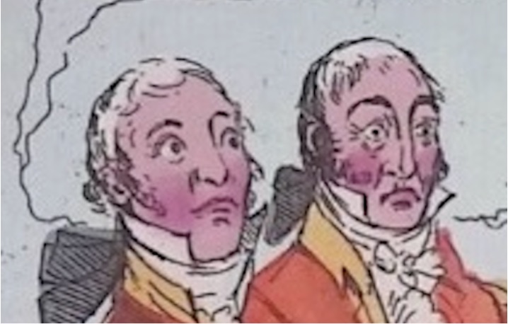 The dialogue blurb between the footmen in the background states, “Oh! This is a day of Jubilee. Cajollery A day we never saw before, a Day of Fun & Drollery!” and the other footman states, “That you may say, the Orangemen may boast of it And since it never can come more ‘Tis fit they make the most of it!” However when you look at the faces of the footmen, they appear to be very serious and concerned. The artist has drawn frowns on each of their faces instead of smiles. This suggests that the dialogue presented is actually meant to be sarcastic suggesting Sidebotham is mocking the petition and the event as a whole.