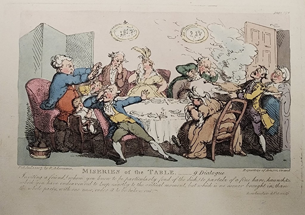 Many of these earlier satirical prints and cartoons published in the eighteenth and nineteenth centuries in England focused on societal issues that affected the middle class. An example of this from our collection in the archives is a print of an illustration by Thomas Rowlandson, titled, “Miseries of the Table” from 1807, featured below.