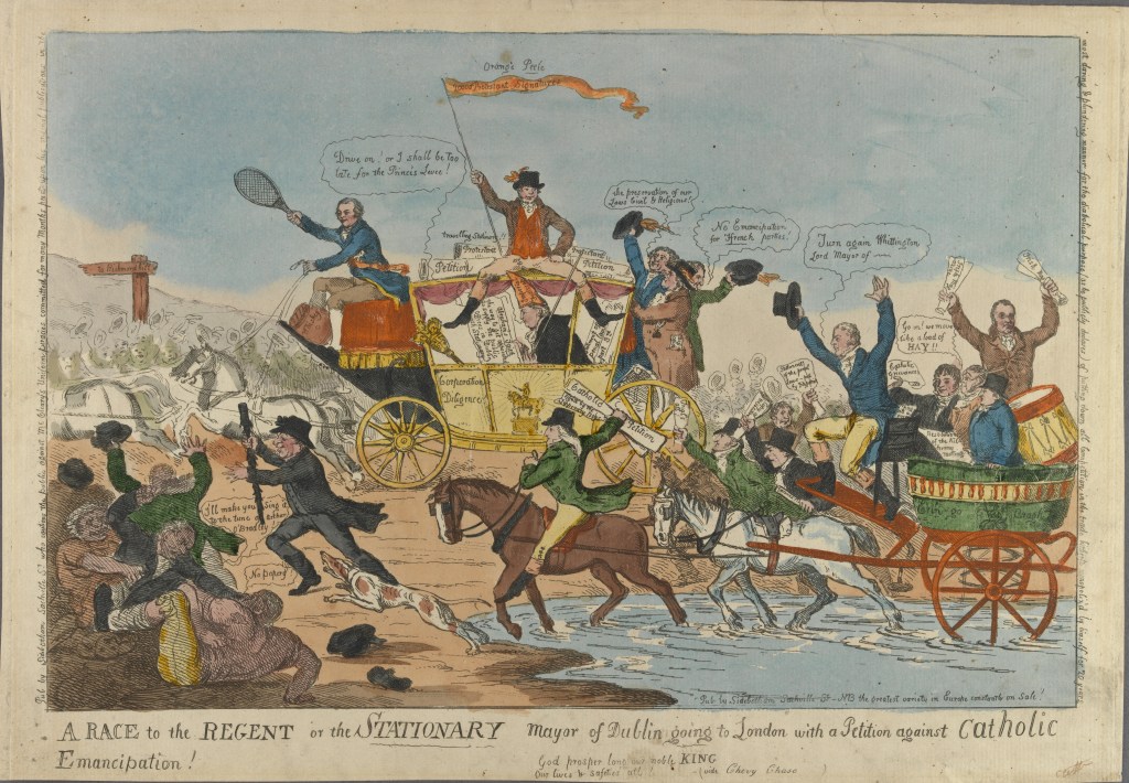 While this specific bill from 1813 may not be very well known now, the fact that so many different cartoons in 1813 commented on King’s visit to the House of Commons demonstrates how monumental emancipation was for Irish Catholics. In addition to this cartoon, Sidebotham published other cartoons in 1813, likely by the same artists, covering the same topic of King’s petition. The one by Sidebotham featured below was titled, “A Race to the Regent or the Stationary Mayor of Dublin going to London with a Petition against Catholic Emancipation!”