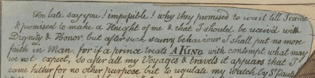 McCleary’s inclusion of King’s self-important dialogue conveys King as extremely conceited: his dialogue shows his shock in not being considered important enough to meet with George IV during his levee. It’s possible that McClearly is attempting to depict Abraham Bradley King’s lack of influence over King George IV within the cartoon.