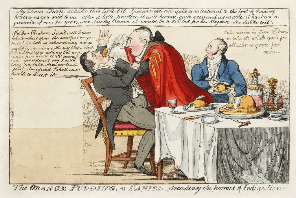 This 1823 cartoon featured below by William McCleary, titled, “The Orange Pudding, or Daniel dreading the horrors of indigestion” is a political commentary on the nature of Daniel O’Connell’s influence on the Catholic emancipation cause. In the cartoon, King is shoving orange pudding into Daniel O’Connell’s mouth.