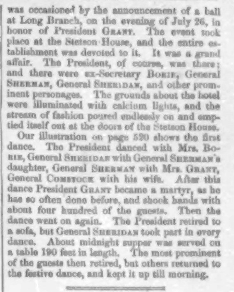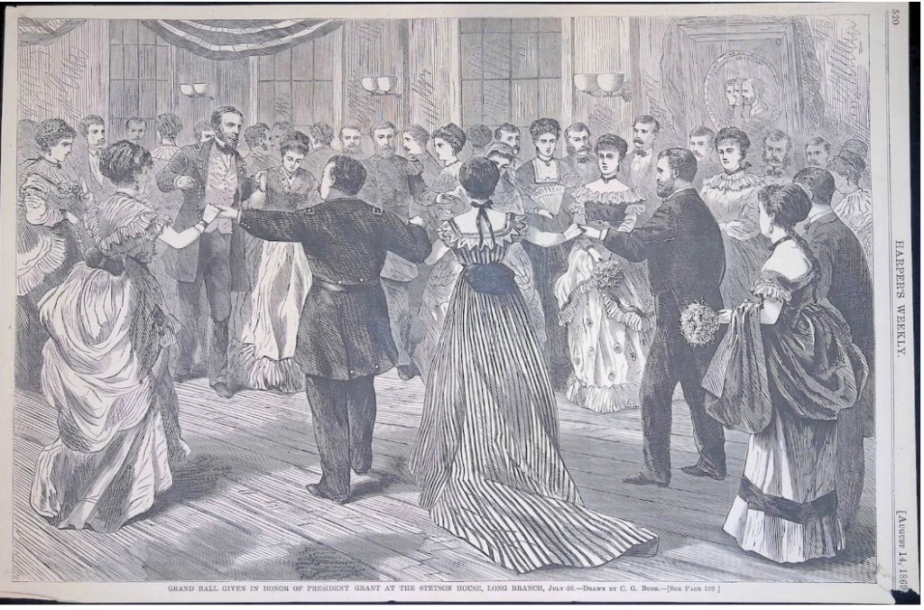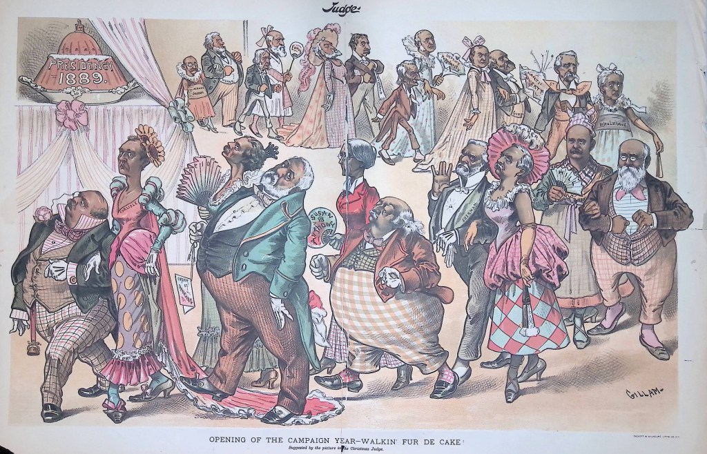 Gillam drew these “couples” at a cakewalk attempting to win the 1889 presidency. A cakewalk has origins prior to the Civil War in which African American slaves would participate in a dance to win a prize, which was typically a cake (Birmingham Historical Society, History of the Cakewalk). Gillam may be drawing these people in blackface to reference that it was African Americans who participated in cakewalks. Gillam is likely using this fact to mock the politicians and journalists involved in the 1888 election by comparing their methods to African Americans and arguing that they are almost performing like participants do in a cakewalk.