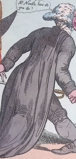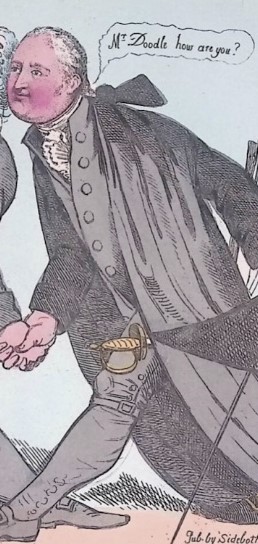 In the cartoon, King, shown as “Mr. Noodle” (facing us) is pictured shaking hands with “Mr. Doodle,” (his back to us) known as George Scholey, Lord Mayor of London, who was in support of his petition to stop Catholic emancipation. Sidebotham’s use of portraying King and Scholey as “Mr. Noodle” and “Mr. Doodle” is meant to imply that both political figures come across as the same foolish persona. The term, “doodle” has origins from German, or Dödel, meaning “simpleton” or “fool.” According to the Oxford English Dictionary, “doodle” and “noodle” had the same connotation by 1764 of meaning “silly or foolish fellow” (Oxford English Dictionary), and many literary references during the seventeenth and eighteenth centuries “put doodle in close contact with comical and underachieving men” (Yankees, Doodles, Fops, and Cuckolds: Compromised Manhood and Provincialism in the Revolutionary Period; p. 528-529). Sidebotham’s use of these colloquial terms to imply that King and Scholey were imprudent civil servants possibly reveals a common public perception of both figures.