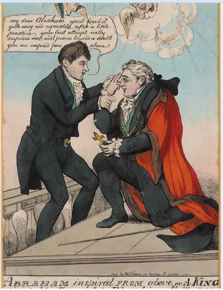 These Williamite festival bans were not only enforced during King George IV’s visit but after as well. He permanently banned the William of Orange ceremonies for Orangemen who desired to use these celebrations as a means to resist concessions to the Catholic population (The Theatre Royal bottle riot of 1822 and the Orange Order in Dublin, p.176). This also influenced Abraham King to step down as the Deputy Grand Master of the Orange Order. McCleary is most likely commenting on Abraham kowtowing to Catholic concessions from O’Connell and above from the king and the Duke of Wellington. It is likely that McCleary is mocking both O’Connell’s and Abraham King’s recent behaviors of working together during the King’s visit to Ireland, and that they both had their own specific intentions in doing so.