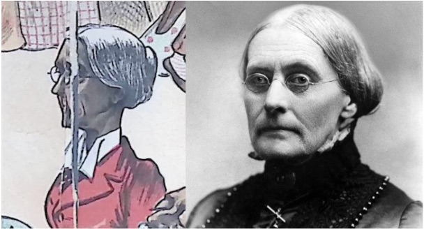 Susan B. Anthony and Benjamin Butler: Anthony was the president of the National Woman Suffrage Association which supported the Republican Party during the 1888 election. Butler was a Democrat during this election, but was opposed to Cleveland following events of the 1884 election. He had also proposed a bill to drop the fines given to Susan B. Anthony following her attempt to vote in 1872: