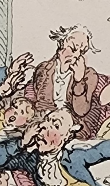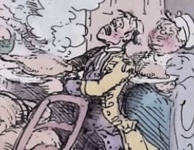 The caption makes note that the host created this dish specifically for his guests who he knows are fond of it, but they order the plate out of the room. This type of generalized satirical cartoon was common for Rowlandson and while it does not depict a specific figure as those that would appear later on, it is still a humorous caricature detailing the “petty outrages, minor humiliations, and tiny discomforts that make up everyday human existence” (Princeton Art Museum’s collections).