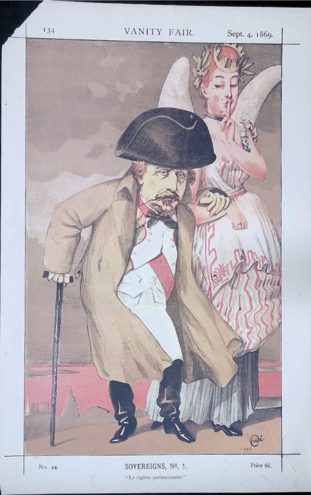 “Sovereigns No. 1” was published in 1869 and depicts Emperor Napoleon III and his relationship with his wife, Eugénie de Montijo. People often said that Napoleon III let his wife heavily influence his foreign policy. This cartoon was likely created in response to the opening of the Suez Canal, which Eugénie attended rather than the Emperor himself.