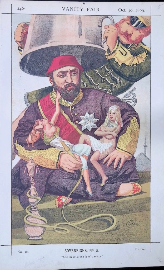 This was also drawn in response to the building of the Suez Canal, and specifically depicts the involvement of the Ottoman Empire, Greece, Egypt, and England. Personifications of Greece and Egypt are drawn in Abdulaziz’s lap representing the control the Ottoman Empire had on them. The Ottoman Empire had been in control of Greece until 1869 due to a revolt in Crete, and until then Greece was heavily involved in the construction of the Suez Canal. Abdulaziz had increased taxes on Sudan and Egypt during this time to pay for the construction of the canal, and to pay back debts to Britain and France.