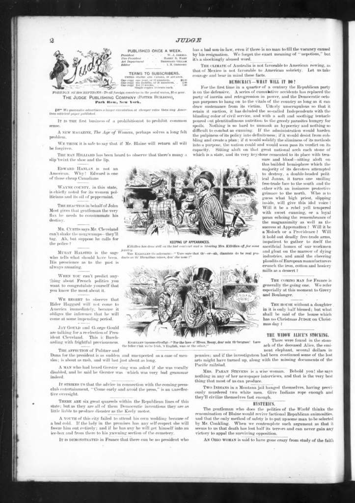 Page 2 of the December 10, 1887 edition of Judge in which the cartoon is featured in, also includes editor commentary on topics like Cleveland and the mugwumps and the state of democracy in the country.
